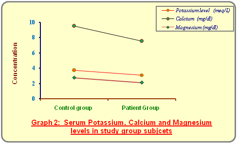 Result: Plasma TAA, serum potassium, magnesium and calcium levels were significantly low in patient group (p<0.05) as compared to healthy controls whereas erythrocyte MDA levels were significantly high in OA subjects. However, serum sodium levels were increased insignificantly (p<0.1) in OA subjects.