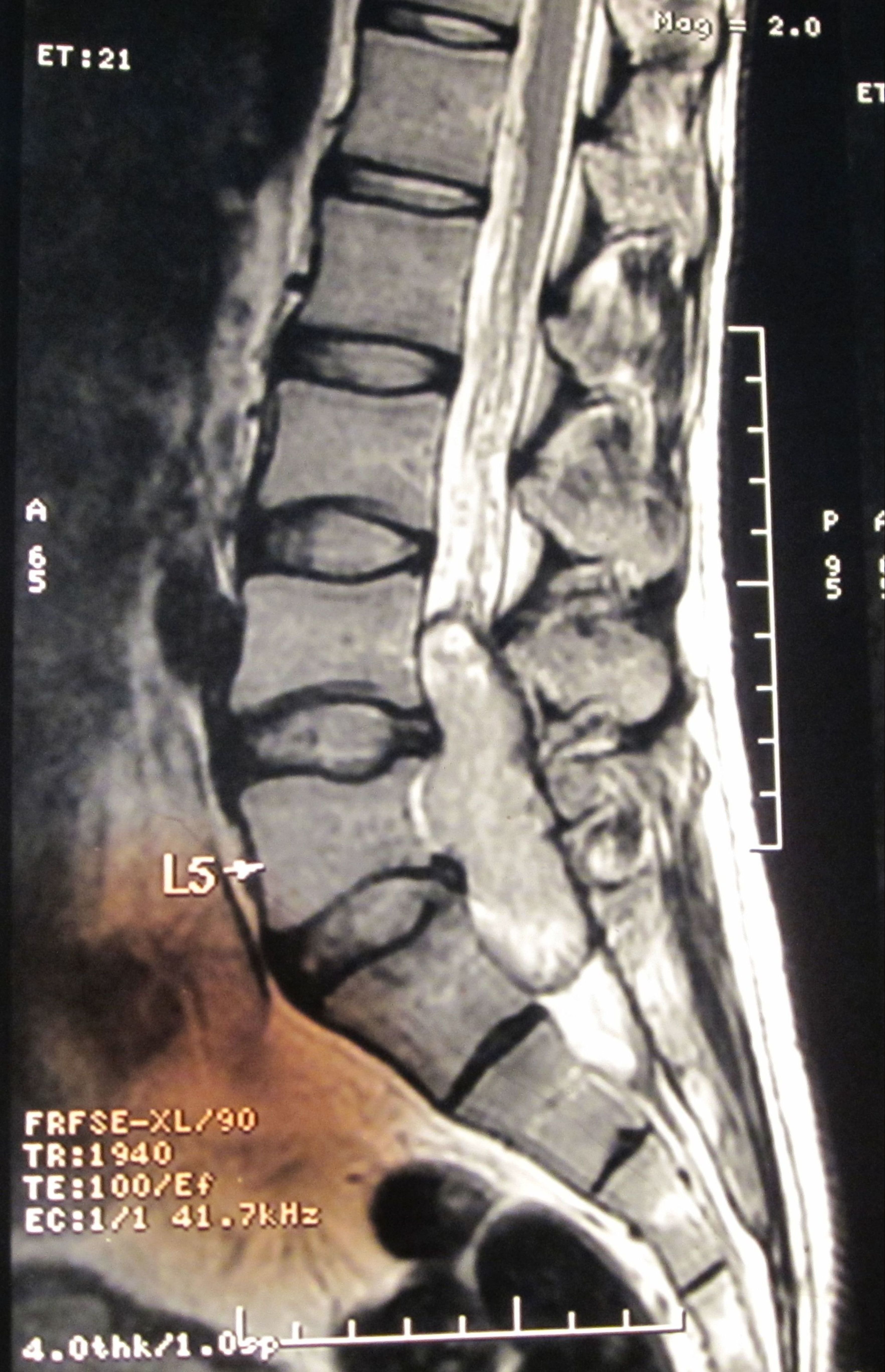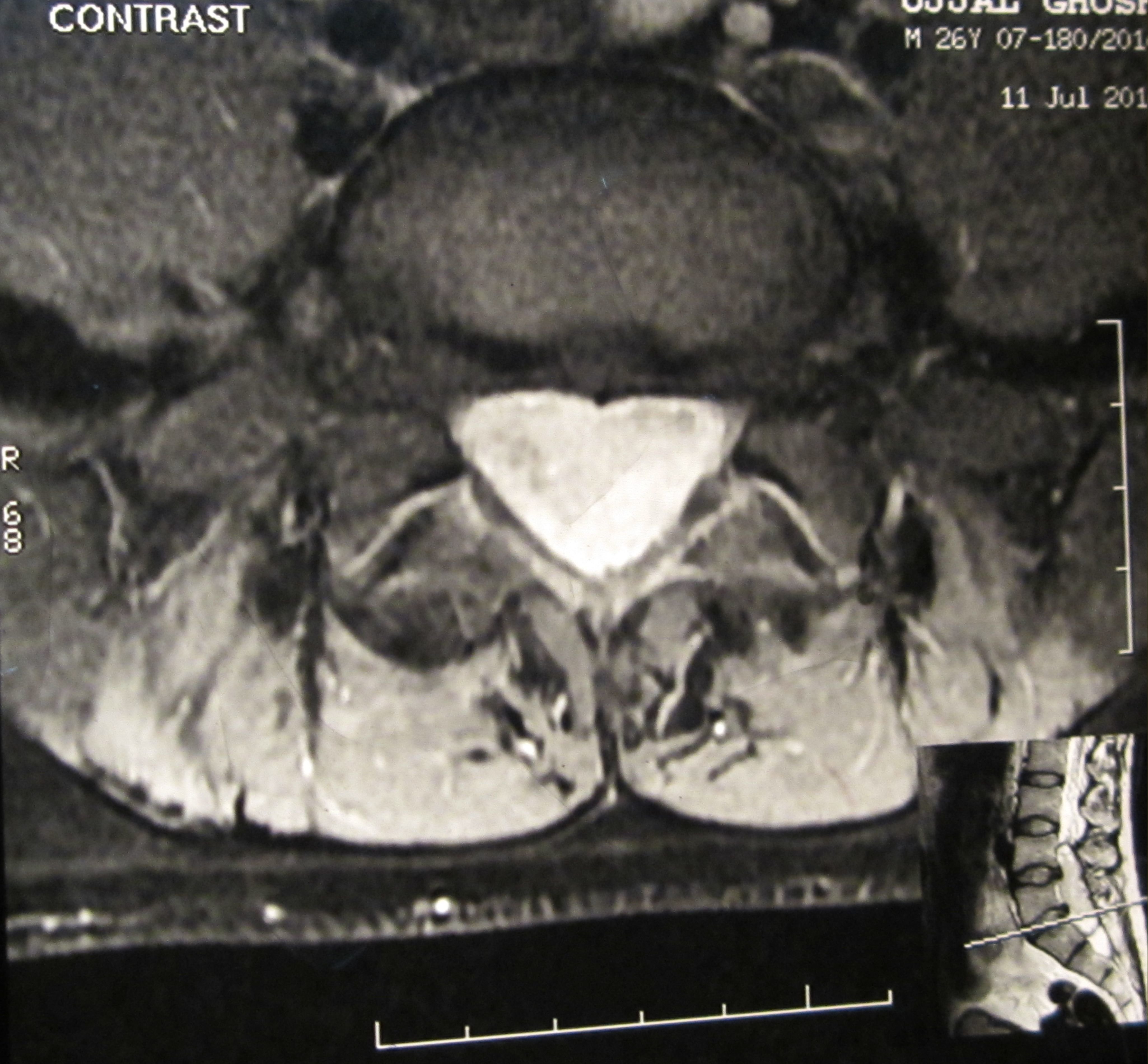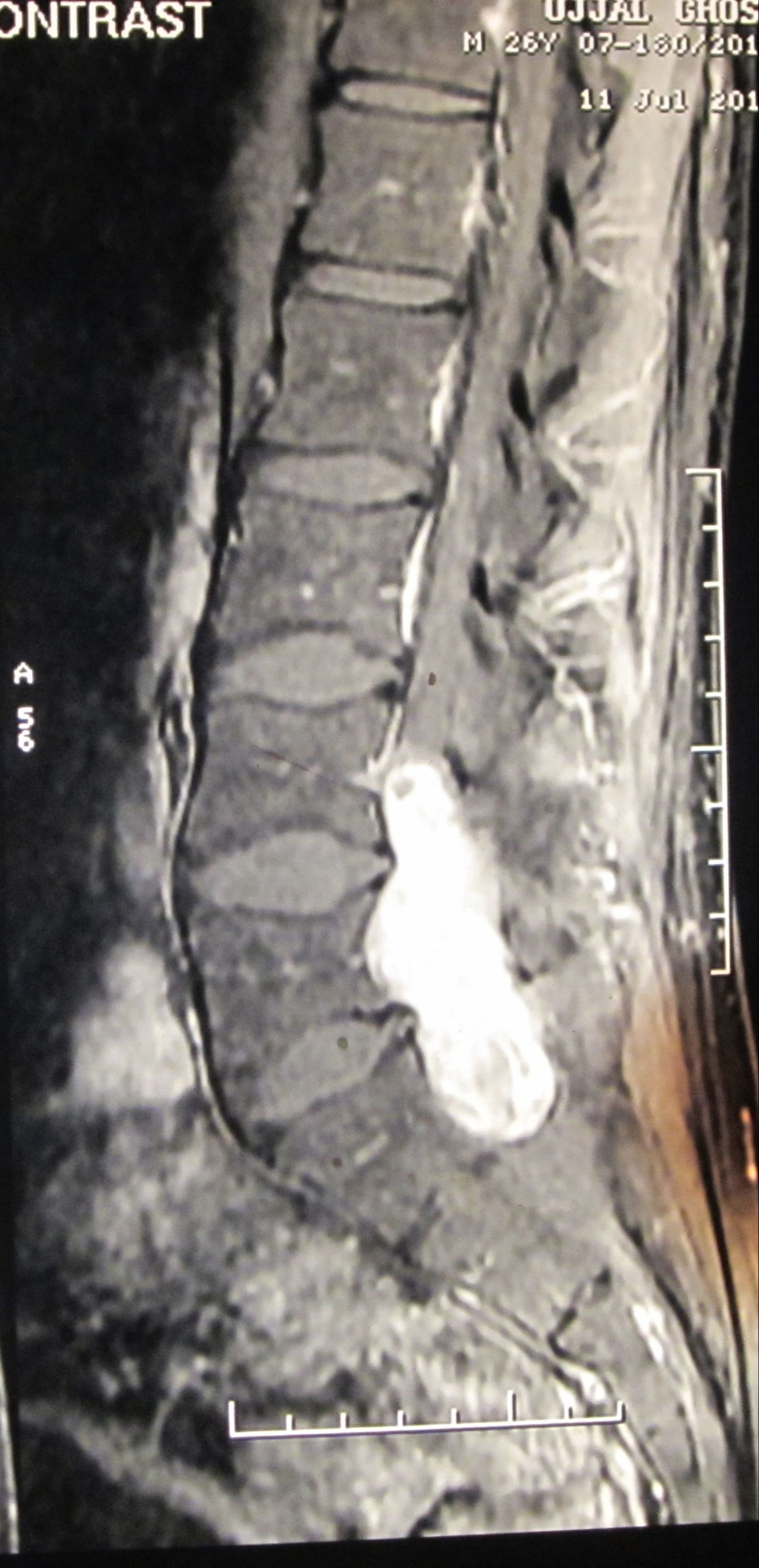 Filum terminale paraganglioma is a rare tumour with usual short segment spinal involvement (one or two segments) as described in various literatures. It can also present with long segment spinal involvement as in our case, the tumour has involved L4 to S1 segments. Prognosis of filum terminale paraganglioma is excellent after total excision as it is classified under WHO grade I tumor. Nonetheless, after subtotal removal, tumour recurrence can occur. Even such an extremely rare entity with a larger spectrum of presentation can be treated successfully by total removal of the tumour. Here we present a fi lum terminale paraganglioma which was diagnosed after histopathology and immuno-histochemistry. Patient made a full recovery after tumour removal.