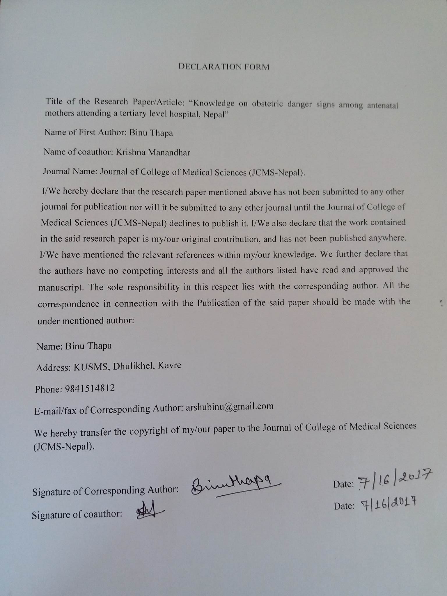 Knowledge on obstetric danger signs among antenatal mothers attending a tertiary level hospital, Nepal