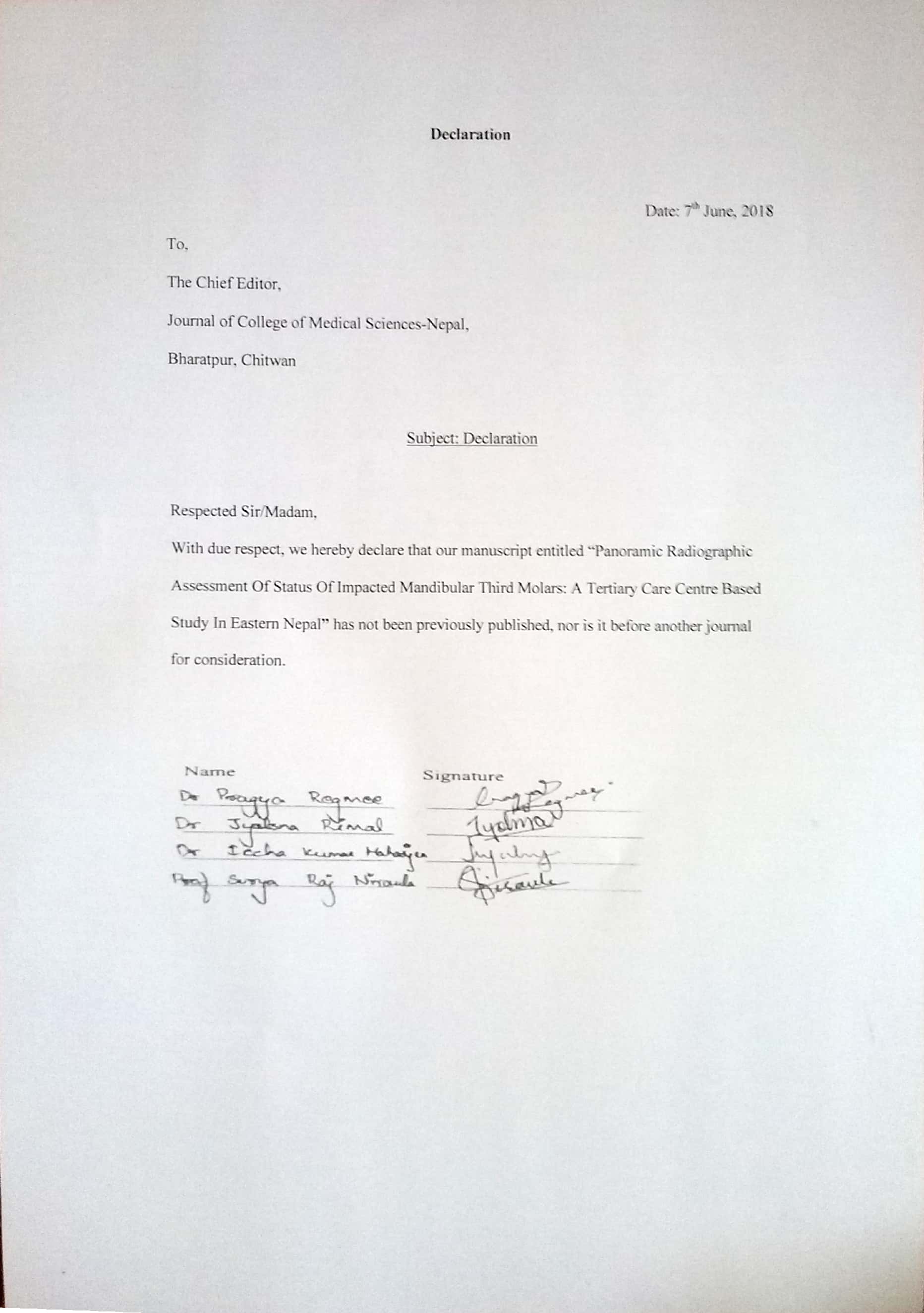 Background: Mandibular third molar (M3M) is the most posterior of the three molars present in each quadrant. Racial variation, genetic inheritance etc can affect the jaw size, size of tooth and ultimately the eruption state of M3M. So, studies of impacted M3Ms have been carried out in various populations. But data relating to these are not evident from most of the parts of Nepal. Hence, this study was done to assess the status of impacted M3Ms in a tertiary care center in eastern Nepal.