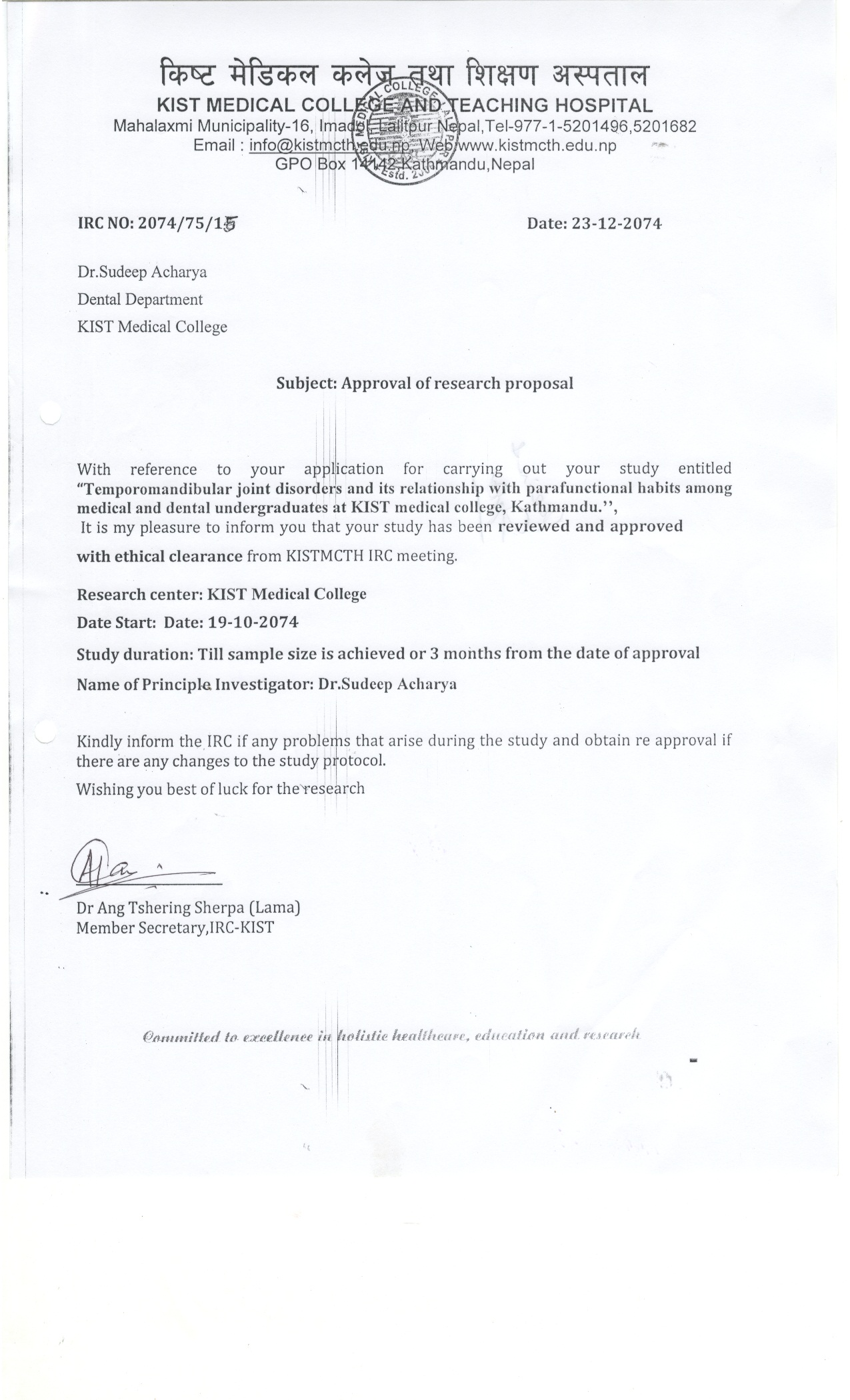 Background: Temporomandibular disorder is a term used to describe problems involving temporomandibular joint, muscles of mastication, occlusion characterized by symptoms such as pain, restricted movements and intermittent joint sound. The present study was conducted to determine prevalence of TMD and to describe its association with parafunctional habits. Materials and Methods: A cross-sectional study was carried out among 345 undergraduate students of KIST Medical College and Hospital. Study population was selected by simple random sampling and the Fonseca Anamnestic Questionnaires were distributed. Data analysis was done in SPSS version 16 . Results: The prevalence of TMD was 47.4% with mild and moderate type of TMD present. The most common habit was chewing gums followed by biting of lips and biting of objects. Statistically significant difference in TMD groups was observed in clenching and grinding of teeth, biting of lips and biting of objects (p<0.001). There was statistically significant association between TMD and the signs and symptoms such as headaches, difficult to open mouth, muscular pain while chewing (p<0.001). Conclusions: A statistically significant association was found between biting of lips, grinding of teeth and mouth breathing with TMD.