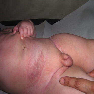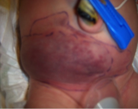 A one day old Moroccan boy was admitted to our neonatal unit with a giant tuberous right abdominal haemangioma. The clinical examination revealed no other vascular tumours. There was no evidence of heart failure. Ultrasound and MRA documented a giant vascular structure suggestive of haemangioma. The tumor responded well to propranolol treatment.