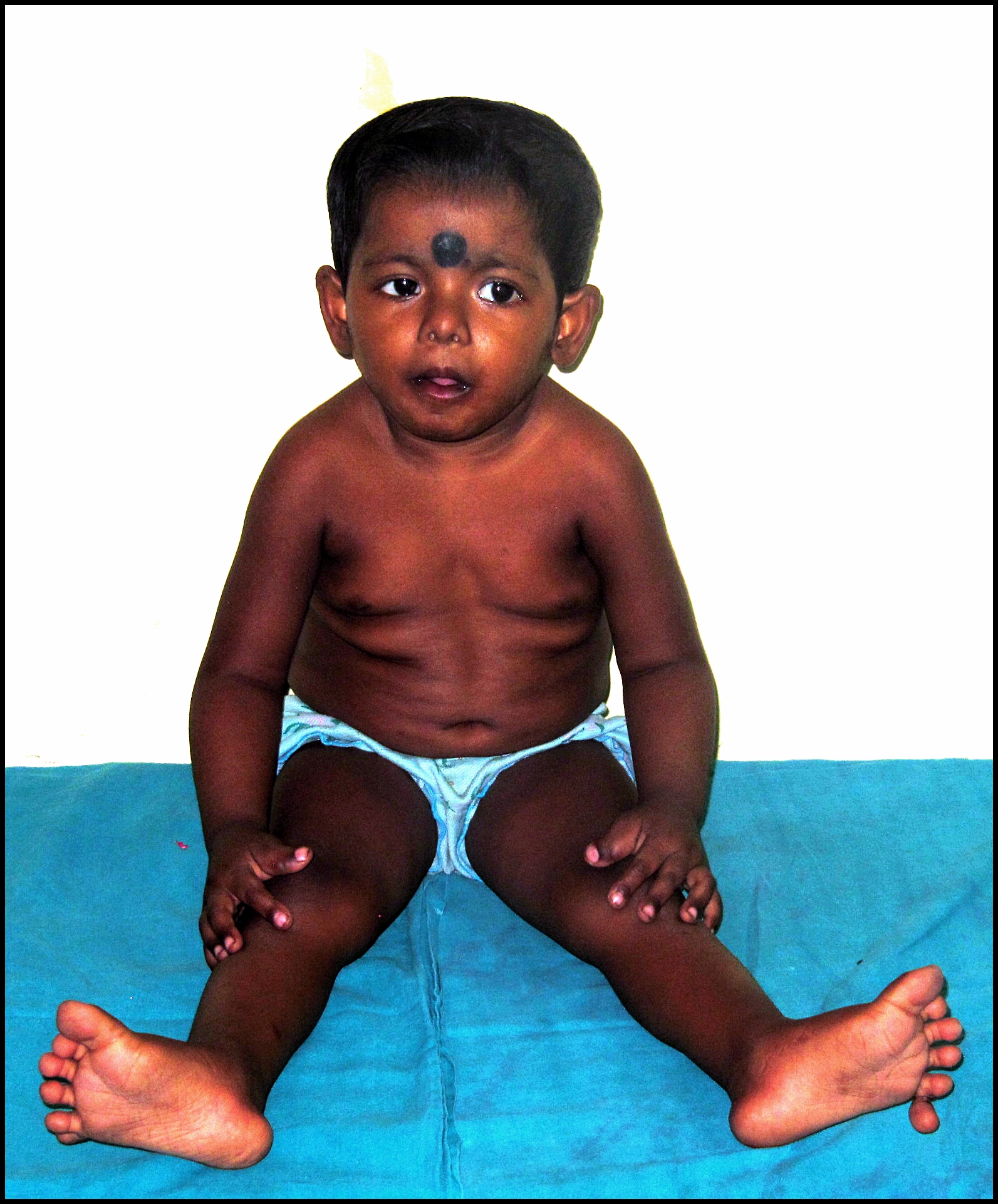 Rubinstein Taybi is a rare genetic syndrome with characteristic facial features, broad thumb and toes, mental retardation. Diagnosis is mainly clinical. Here we report a 2 and ½ year old female child with typical facial features and other anomalies characteristics of Rubistein Taybi syndrome. Among the different features described-polydactyly, syndactyly, micrognathia are occasional abnormalities to be found in this syndrome. Bilateral pits on posterior aspect of helix is also a feature described in very few literatures.