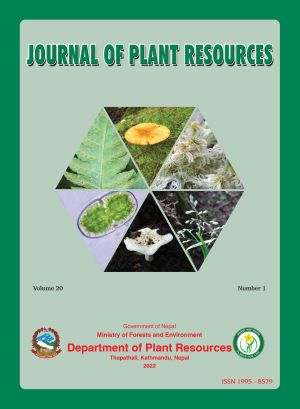 Vol. 20 No. 2 (2022)The current issue is the outcome of the informative research articles presented during International Conference on Biodiversity and Bioprospecting, organized by Department of Plant Resources in Kathmandu on June 22-24, 2022. The Department of Plant Resources is going to publish those articles as a Special Issue, in the Journal of Plant Resources Volume 20, Number 2, year 2022. Twenty one peer reviewed articles based on original research have been incorporated in this special issue. The articles have been categorized as taxonomy, ecology, ethnobotany, biotechnology, propagation, anatomy, conservation practices, non timber forest product and phytochemistry.
