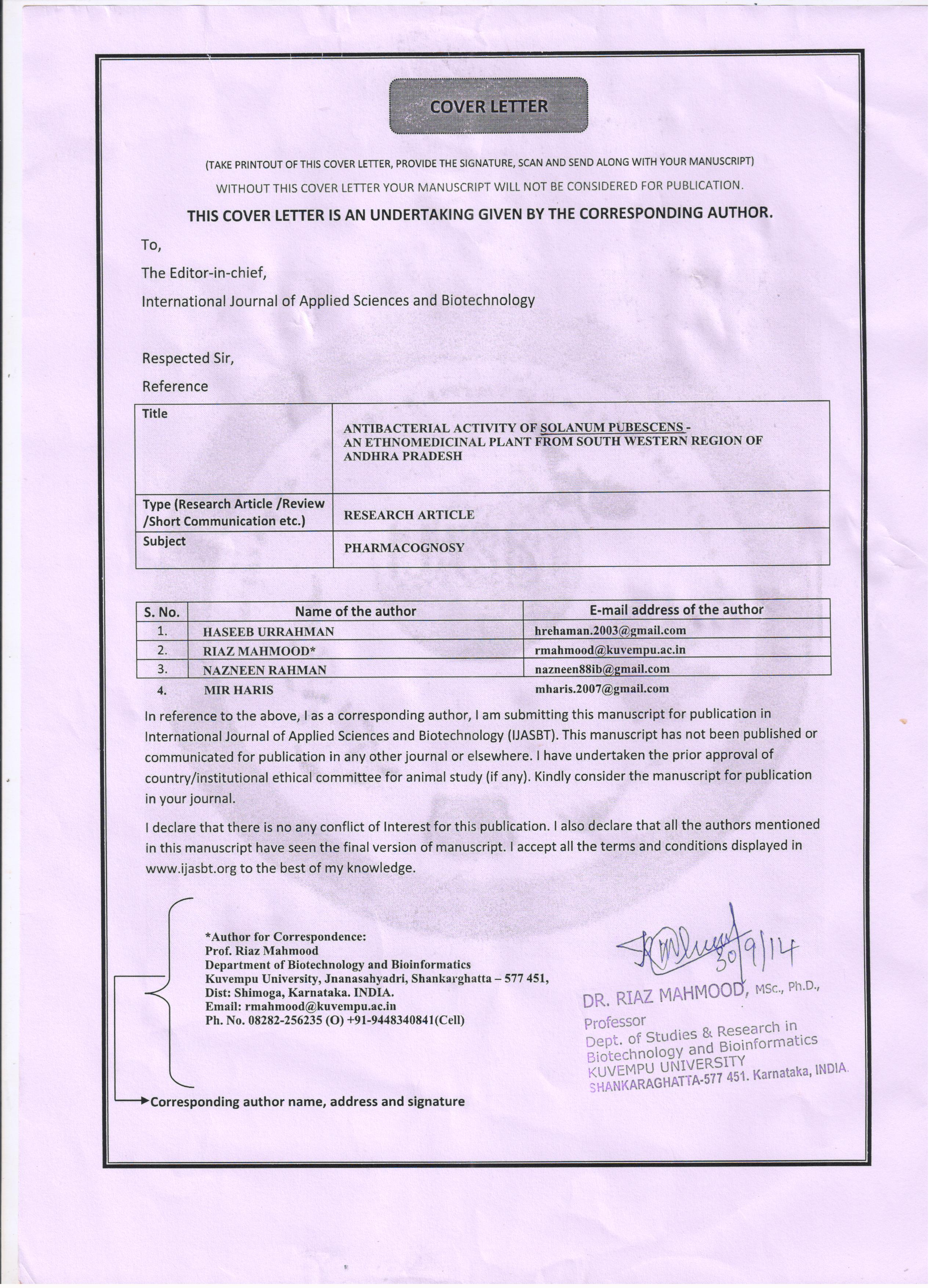 The present movement to find out alternative antibacterial drugs from medicinal plants and the presence bioactive phytochemicals in fruit andstem bark of Solanum pubescens, promoted the authors to take up the antibacterial evaluation of fruit and stem bark extracts of Solanumpubescens. Against clinical and plant pathogenic bacterial strains by employing the methods of National Committee for Clinical LaboratoryStandards (NCCLS). It was observed that all the extracts showed inhibition zone against one or more of the tested bacteria between 80 to 160 μg/ml concentrationswith 3.17 ±0.17 to 10 ± 0.17 mm inhibition. The spectroscopic determination of MIC and MBC exhibited by extracts went between 100-300μg/ml. In fruit extracts, fruit chloroform (FC) has inhibited all the tested organisms, similarly, fruit ethyl acetate (FEA) inhibited Bacillussubtilis and Xanthomonas sp. whereas, fruit ethanol (FET) has been restricted to inhibit Bacillus subtilis at 100 μg/ml. Furthermore, amongall the active extracts of stem bark extracts bark chloroform (BC) showed potential inhibition of Bacillus subtilis and Escherichia coli with81.44% and 82.17% respectively. Similarly, bark bottom crystals (BBC) extracts inhibited Bacillus cereus and Xanthomonas sp. with 77.38%and 77.72% respective inhibition at 100 μg/ml concentration.The present exploration has revealed that the extracts from fruit and stem bark of S. pubescens revealed potential antibacterial activity againstGram (+) and Gram (-) bacteria, which are validating the ethnomedicinal claims and this the first report of investigation of above extracts forits antibacterial activity.