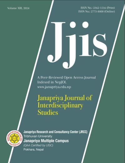 Janapriya Journal of Interdisciplinary Studies (Jjis) is a multidisciplinary journal that covers a wide range of disciplines. It publishes original researh article, review article, general article and book review. It is published annually by Janapriya Research and Consultancy Center (JRCC), a research wing of Janapriya Multiple Campus, Pokhara, Nepal.