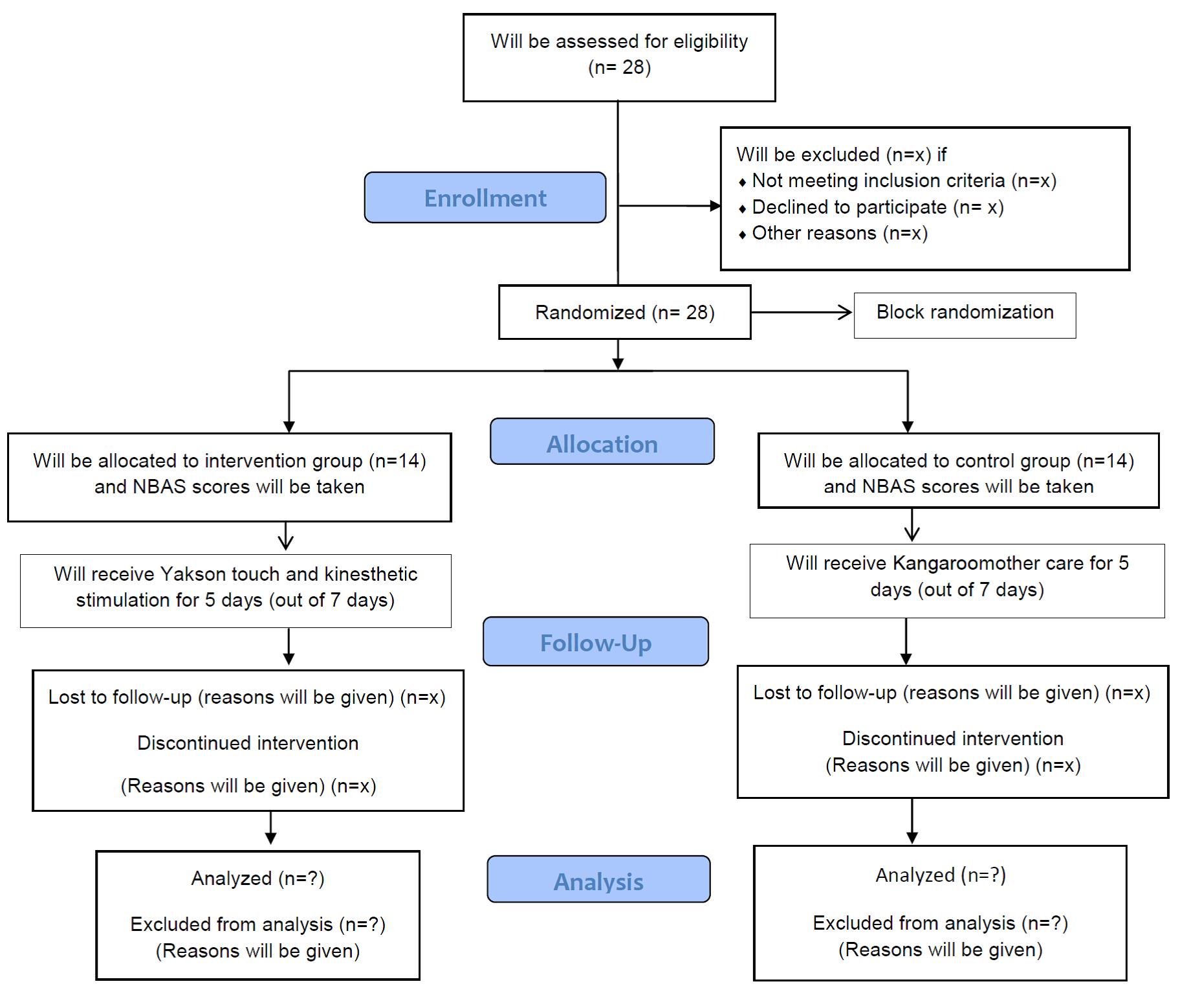 Material and Methods: Neonates will be recruited via parental consent from a recognized tertiary care teaching hospital for this two-group pretest-posttest design of randomized controlled trial (RCT), with allocation into either a control group (n=14) or experimental group (n=14) by block randomization method. The experimental group will receive Yakson touch and kinaesthetic stimulation, whilst the control group will receive conventional handling inclusive of developmental positioning and Kangaroo mother care. The duration of intervention will be five out of seven days. Neonatal behavioural assessment scale (NBAS) will be performed at baseline and then on the 7th day to ascertain the intervention effectiveness.