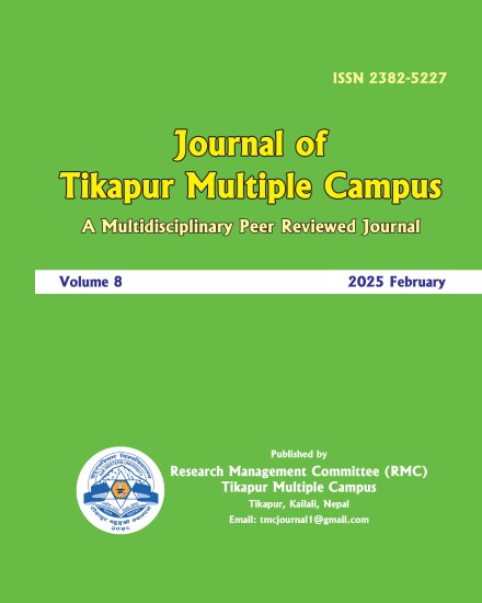 The Journal of Tikapur Multiple Campus is published by the Research Management Cell (RMC), Tikapur Multiple Campus, Tikapur, Kailali, Nepal. It is a multidisciplinary journal that gives the space to the research base articles from diverse field of scholarship including English language education, applied linguistics, development studies, economics, literature, tourism, applied science, Nepali language, pedagogy etc.