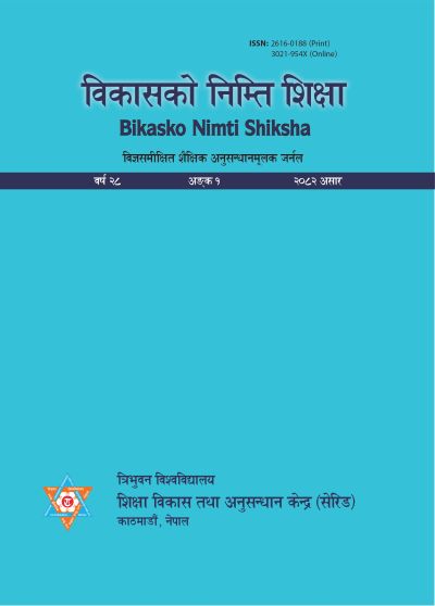 Bikasko Nimti Shiksha (विकासको निम्ति शिक्षा) is published by the Research Centre for Educational Innovation and Development, CERID, Tribhuvan University. It publishes the articles written in the field of education, and the articles can be written on any of the pertinent concerns in education, including educational history, planning, contents, pedagogy, evaluation, and formal and non-formal education.