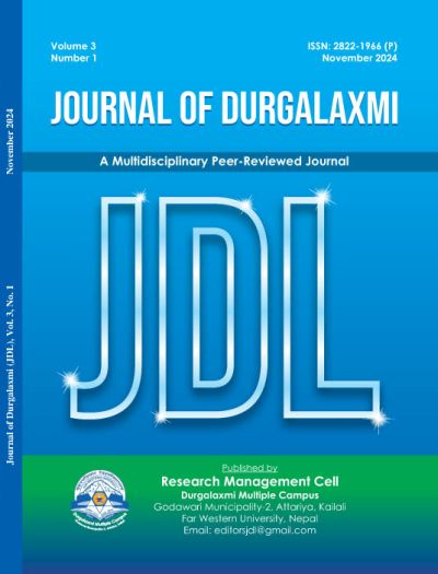 The Journal of Durgalaxmi (JDL) is a double-blind, peer-reviewed academic publication overseen by the Research Management Cell (RMC) of Durgalaxmi Multiple Campus, located at Attariya, Kailali, Nepal. As a multidisciplinary journal, JDL welcomes articles from diverse disciplines including Education, Literature, Management, Humanities, Science, Law, Linguistics, and ICT among others. It accepts submissions in various formats such as research articles, action research reports, reflective articles, and book reviews, in both Nepali and English languages. The publication is available in both printed and electronic formats, accessible to its members globally. Indexed in NepJOL and assigned DOIs since its inaugural volume, JDL serves as a credible forum for scholarly discourse and knowledge dissemination.