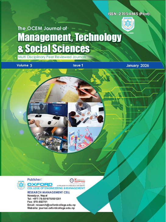 We are pleased to announce the release of Volume 4, Issue 1 of The OCEM Journal of Management, Technology, and Social Sciences. This edition marks a new chapter in our ongoing commitment to publishing high-quality, impactful research. It features a diverse range of articles that explore the intersection of management practices, emerging technologies, and the evolving social landscape. As always, our journal remains dedicated to providing a platform for thought leaders to share their insights and foster meaningful discussions. Each article in this issue is assigned a DOI by NepJOL, and we continue our policy of offering open access without any publication fees. We trust that this issue will inspire further advancements and collaborations across disciplines, contributing to the growth of knowledge in our focus areas.