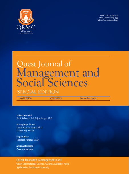 Quest Journal of Management and Social Sciences is published by the Quest Research Management Cell of the Quest International College, Gwarko, Lalitpur, Nepal which is affiliated to Pokhara University. Quest Journal of Management and Social Sciences (QJMSS) is a double-blind peer reviewed scholarly journal devoted in publishing high-quality papers using multidisciplinary approaches with a strong emphasis on emerging issues of business, economics, communication, management, finance, administration, English and social issues in half yearly basis. It was established in 2019 to accommodate qualitative, quantitative and mixed methods of research. It is not for profit and fully abides to UGC and QAA guidelines. Its main purpose is to disseminate ideas and research findings in various socio-economic development and managerial issues related to Nepal and other countries. It brings out scholarly research articles and other features. It intends to serve as an outlet with strong theoretical and empirical research for an intellectual forum for the communication of ideas among social scientists in Nepal and rest of the world. The authors does not have to pay any kinds of publication charges for open access.