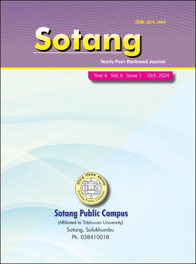 Sotang, Yearly Peer Reviewed Journal is published by the Sotan Public Campus (affiliated to Tribhuvan University), Sotang, Solukhumbu, Nepal. It is a blind peer reviewed journal committed to publishing articles/papers on researching, teaching, and learning of multi-disciplinary subjects.