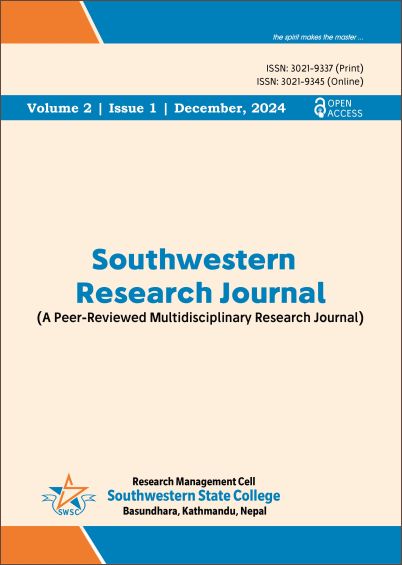 Southwestern Research Journal (SRJ) is published by Research Management Cell (RMC), Southwestern State College, Basundhara, Kathmandu, Nepal. It publishes scholarly articles in multidisciplinary fields in science and technology, management, humanities and social sciences, arts, language and literature.