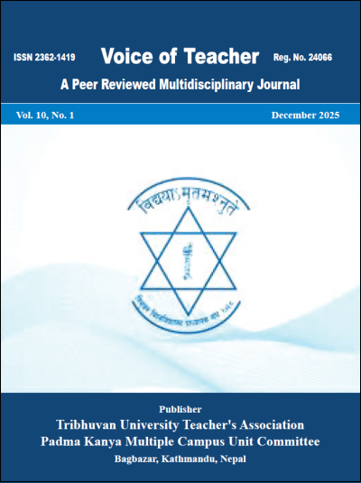 Voice of Teacher is a peer-reviewed multidisciplinary journal published by the Tribhuvan University Teachers' Association, Padma Kanye Multiple Campus Committee, Bagabazar, Kathmandu, Nepal. The journal seeks to provide a supportive environment for multidisciplinary researches on various disciplines under pure science, management, humanities and social sciences
